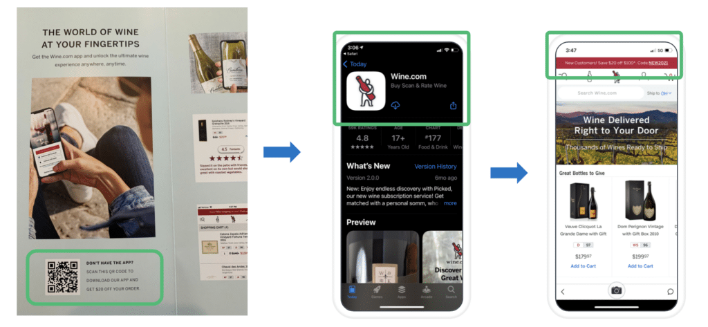 Wine.com QR codes on product packaging. Using QR codes on product packaging or inserts captures the high level of engagement of an existing user with demonstrated brand affinity. including a method to convert them into an app user is a low lift.
