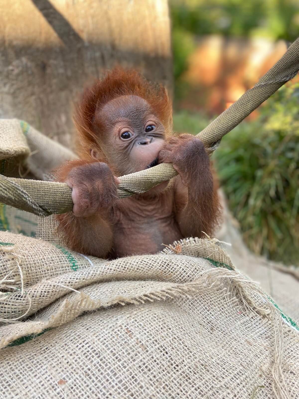 Nangka, a male Sumatran orangutan, was born in May and came to Zoo Atlanta from the Sacramento Zoo to be cared for by adoptive mom Madu after his birth mother did not provide appropriate care.