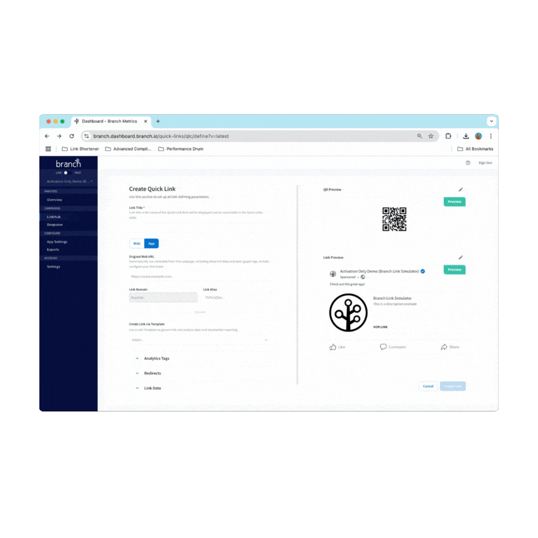 Activation streamlines the link creation process into a single, intuitive workflow with unlimited user seats so anyone in your organization can create high-quality links. Link templates and role-based permissions help you scale link creation without sacrificing link governance or consistency. From the Dashboard, you can create deep links, web links, or QR codes from the and leverage our bulk creation tools, or developers can help automate campaigns via API.