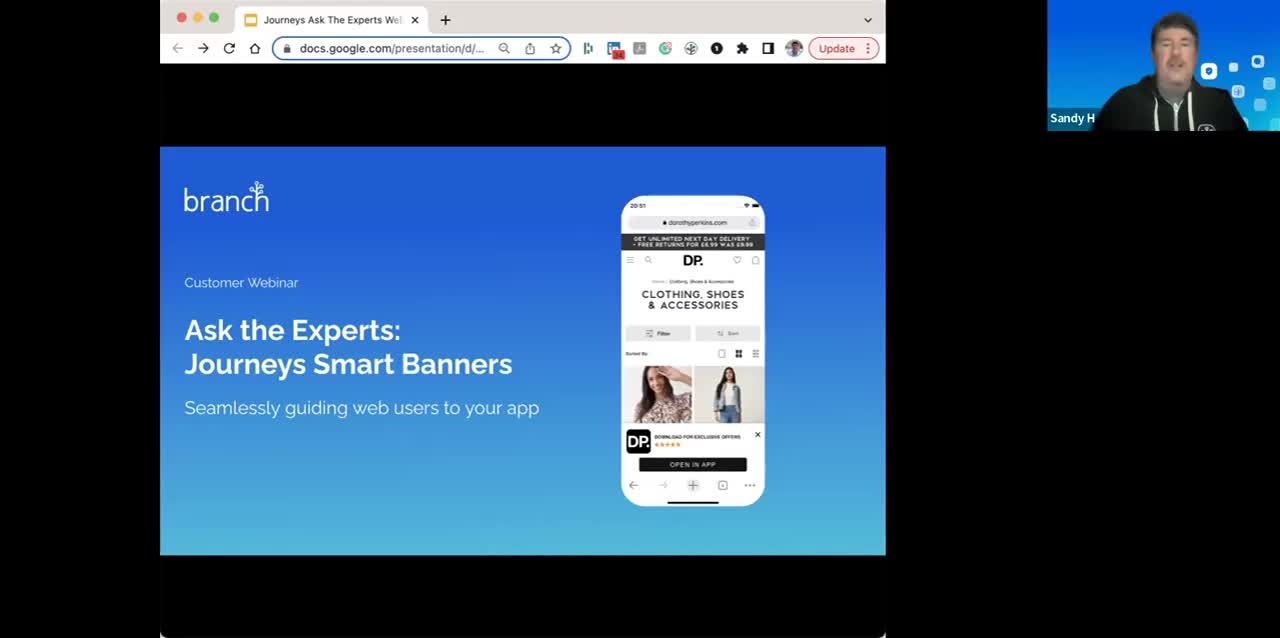 Join Branch for a customer-only Ask the Experts webinar on Tuesday, March 21st at 9 AM PST to learn about our Journeys Web-to-App Smart Banner product and use cases. This Branch customer-only webinar will be hosted by Loyalty and App CRM Manager Gabrielle Madeira, Sr. Director of Business Strategy Reed Kuhn, Senior Product Manager – Growth, Andrew Sylvia and Senior Product Marketing Manager – Team Lead, Sandy Hirschel.