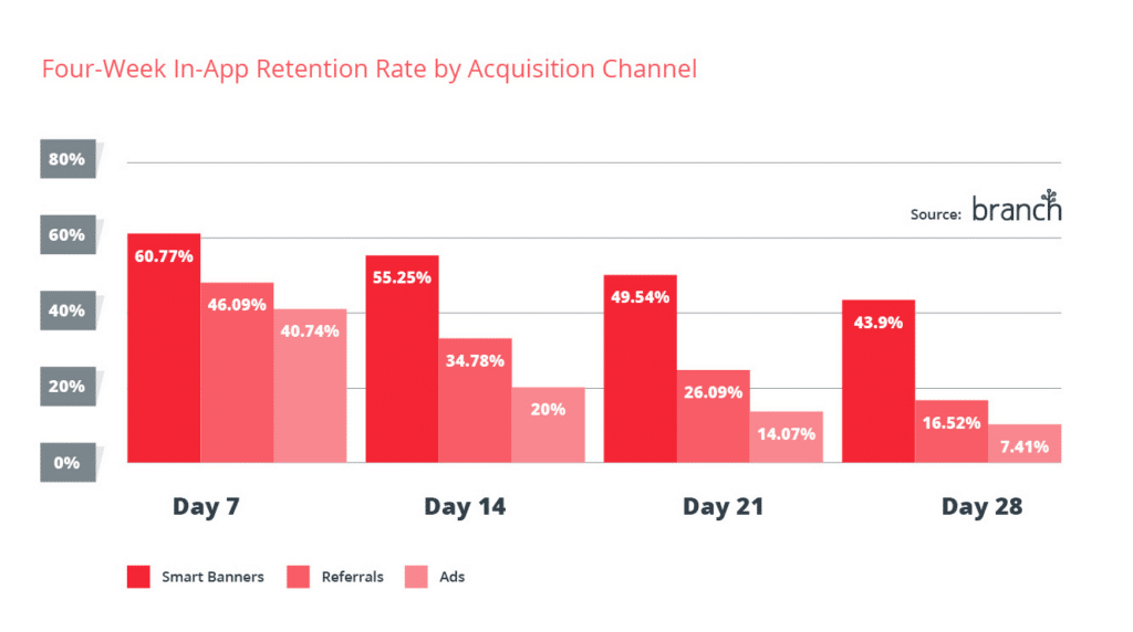 We recommend auditing the current channels you’re using to acquire users to determine what’s working, what’s not, and what you should further invest in. This is even more relevant today, as your acquisition strategies might not be working the same way due to COVID. You want your acquisition channels to acquire high-value users likely to stick around. In a Branch study, we found that users from organic channels like smart banners have better retention rates than paid channels: