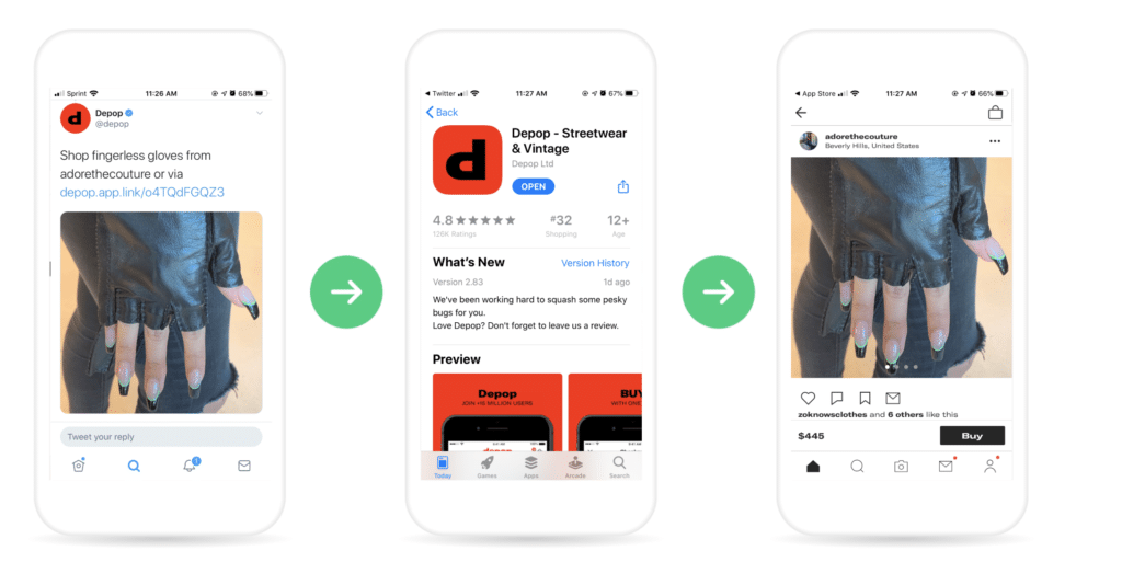 This example from Depop is a fabulous example of a deep linking flow. Users see a link on Twitter advertising a product. When they click, they’re directed to the App Store if the app is not installed. Once they install the app, the context of the user’s click is preserved upon install, and users are directed to the product page within the app. Goodbye dropoff, hello engagement, installs, and in-app purchases!