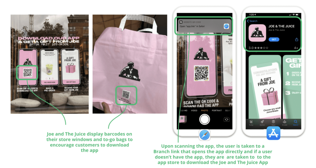 Peet’s, Belk, and Joe and the Juice placed QR codes on their store locations to encourage customers to download the app. This strategy is quite a low lift as it leverages your existing customer base who already are aware of and actively interact with your brand. Bonus: Run a competition between stores to see who can drive the most downloads!