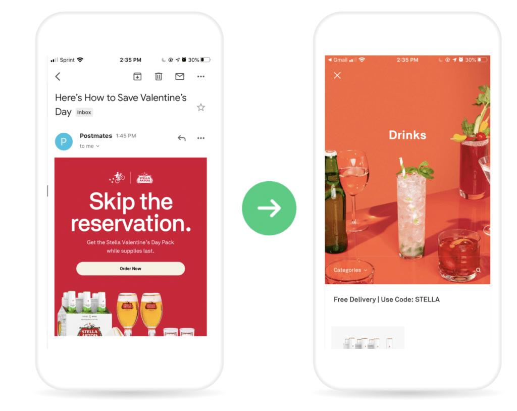 More than 70% of people read their email on mobile, so it’s imperative your email campaigns are mobile-friendly, but this also presents an opportunity to drive users to your app. By deep linking emails, you can ensure users are taken to the right place when they click an email link on mobile. Postmates does a great job with this — in the example below, you can see a user that clicked an email promotion is routed straight to the same promotion within the app. With Branch’s Universal Email, you can easily build email campaigns that work everywhere, maximize down-funnel conversion rates by giving users a better experience in your app, and gain full visibility into email performance by connecting these touchpoints.