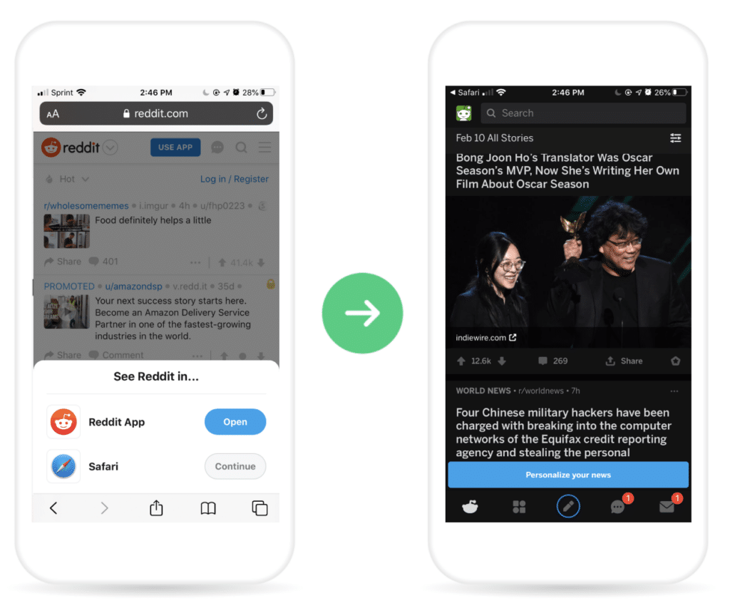 As mentioned, bridging the web-to-app gap is key to delivering a seamless experience and provides a cost-effective channel for app user acquisition. Consider the below example from Reddit: when navigating to Reddit’s website on mobile, the user is presented with a half-page interstitial that encourages them to open the app. Since the user already has the app installed, clicking the “open” button brings them straight to the app. For a user without the app installed, the context of the user’s click would be preserved through install so they would still be routed to the correct content within the app.