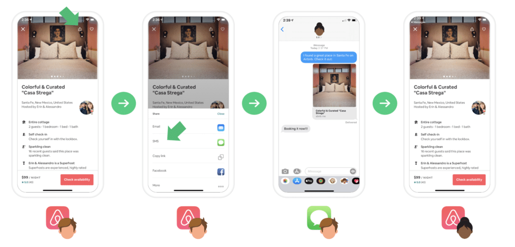 In the example below, one user finds a great listing on Airbnb for a cottage in Santa Fe. He texts the listing to his friend via the in-app sharing feature, which auto-generates a deep link. When the receiving user clicks the link, she is routed to the same listing within the app. When deferred deep links are built into your app, this experience remains seamless even when the receiving user doesn’t already have the app installed (like below).