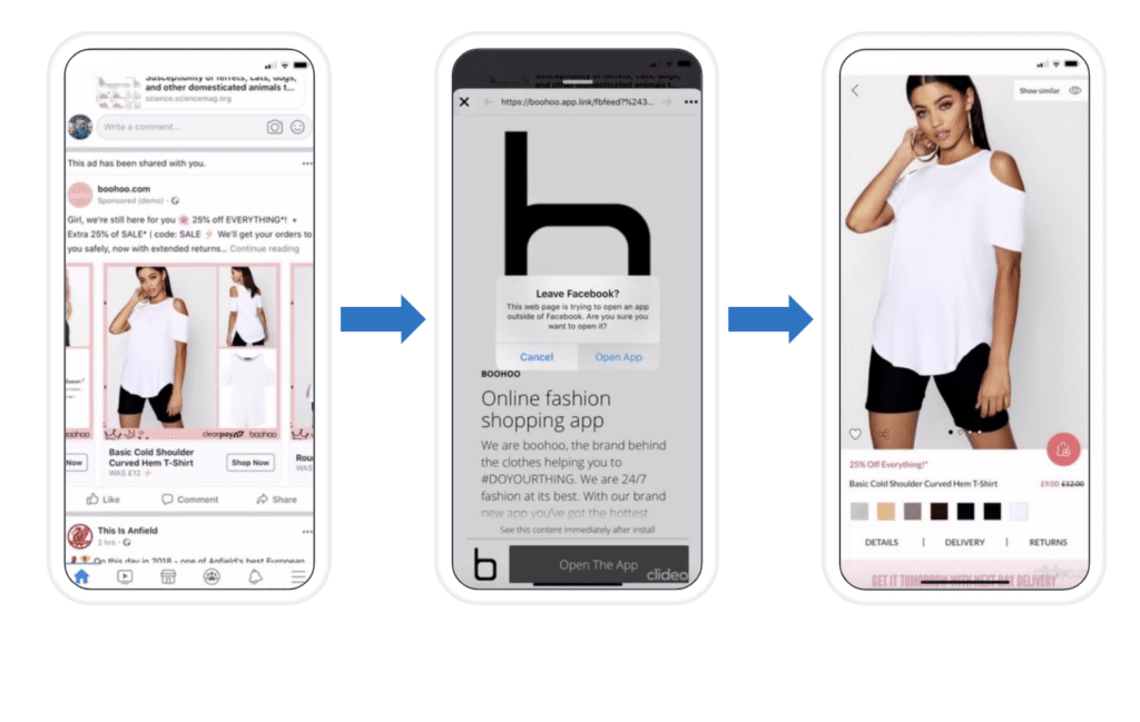 Here’s another great example of routing users from social media into your app. Boohoo directly deep links users from Facebook ads right into the corresponding in-app product displayed on the ad.