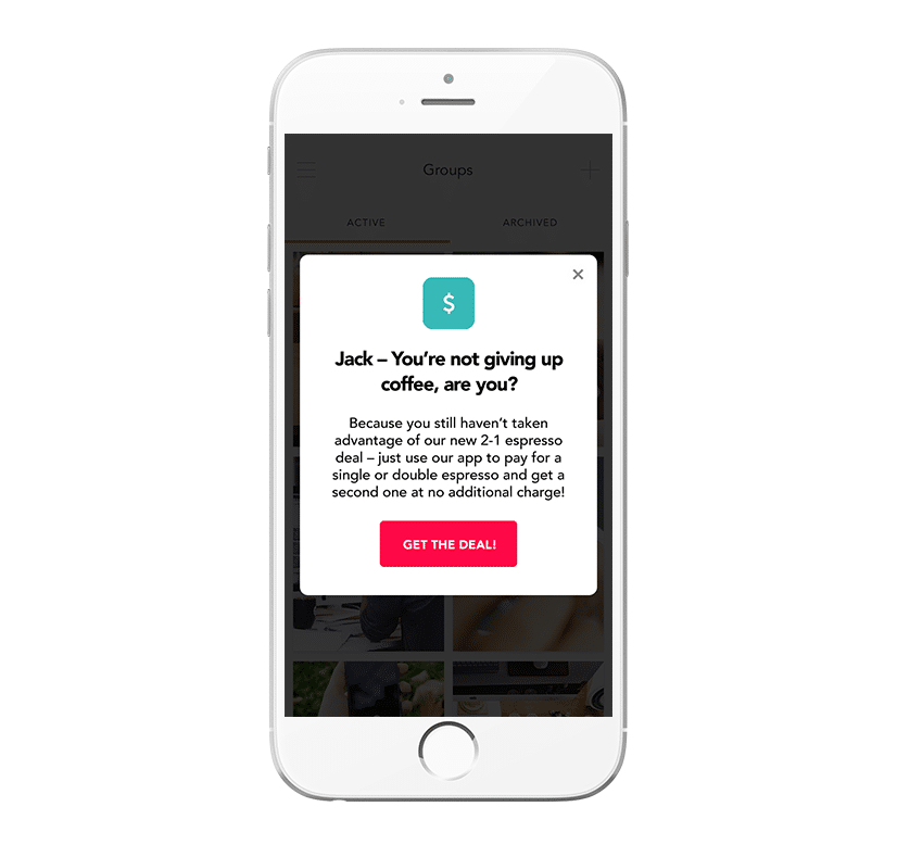 This in-app message shows the app’s value and promotes an in-app deal to engage with a user who hasn’t been using the app. Source: https://www.braze.com/blog/in-app-message-best-practices/