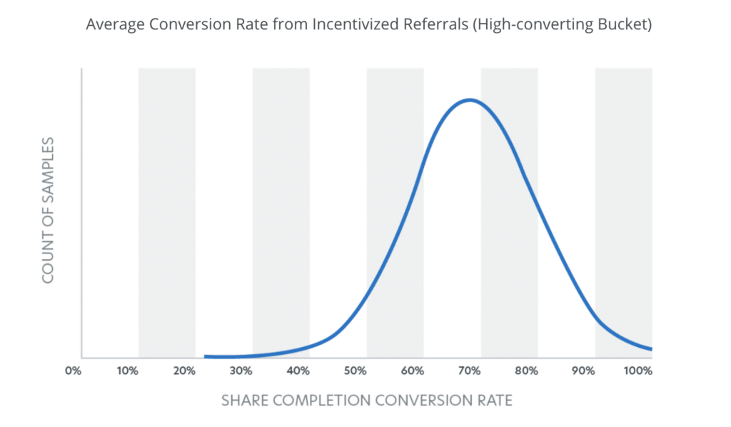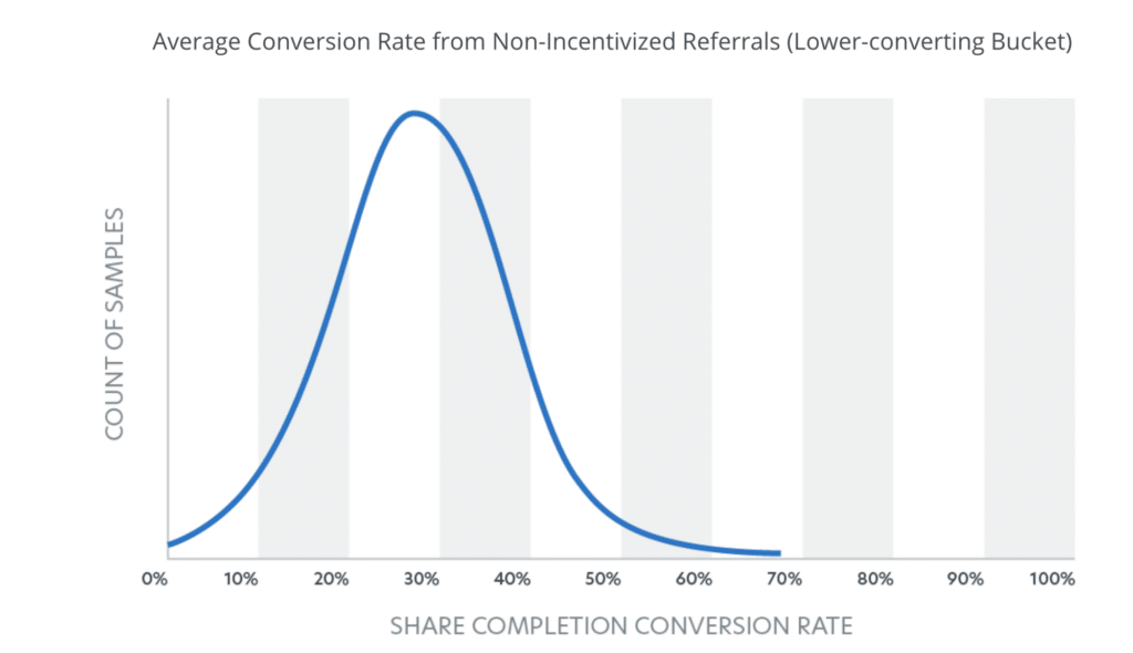 The “high converting bucket” made up of incentivized referrals had an average conversion rate of 70%. In comparison, the “low converting bucket” consisting of non-incentivized referrals had an average conversion rate of 30%.