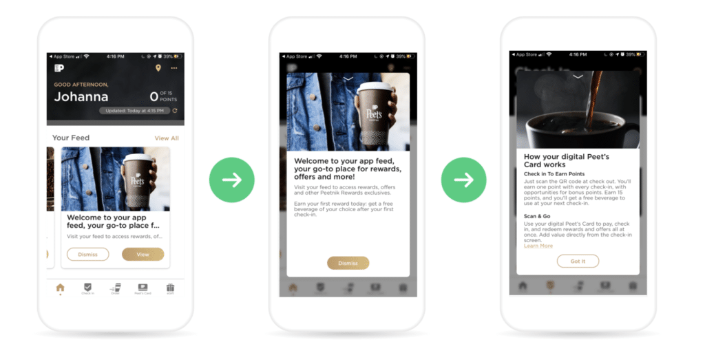 The Peet’s app has many features, but shows and states the core app’s core functionality and calls out the next action the user should take (perform their first check-in). The app also explains the core functionality and how it works throughout onboarding.