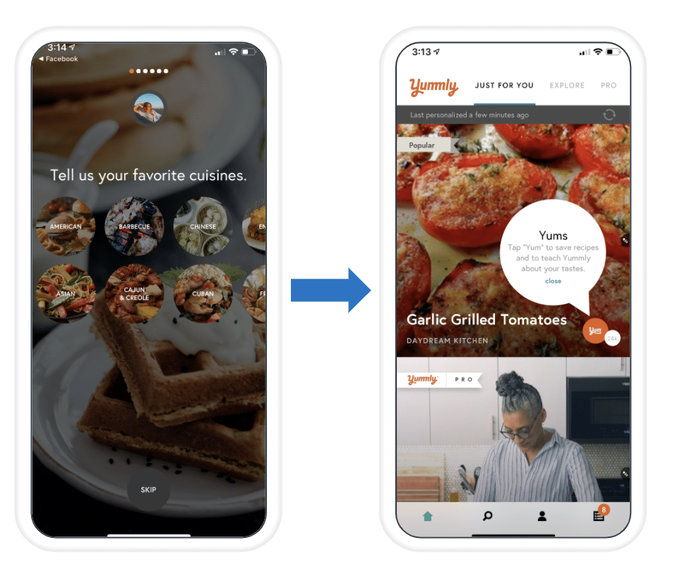 By collecting key information on food preferences and restrictions during the onboarding experience, Yummly curates content for the user to provide them with personalized cuisine recommendations. The result: happy users who are more likely to keep coming back.