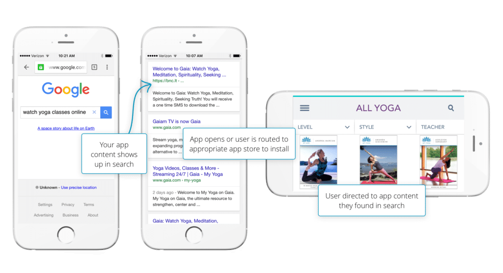 Example: A user searches Google for online yoga classes, selects a result, and is taken directly to that content within the Gaia app through an indexed deep link. The user is now viewing the content they searched for on a platform where they’re most likely to engage.