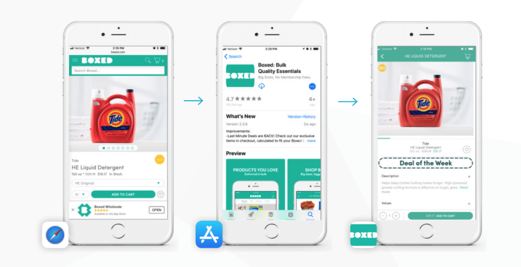 In this example, a mobile user shopping for laundry detergent lands on the Boxed mobile website. The user then taps the app install banner, installs the app, and is deep-linked directly to the same product they were viewing on the mobile web. The onboarding process is seamless and contextual, and the high-intent mobile web user is now on a platform where users historically convert at a 300% higher rate.