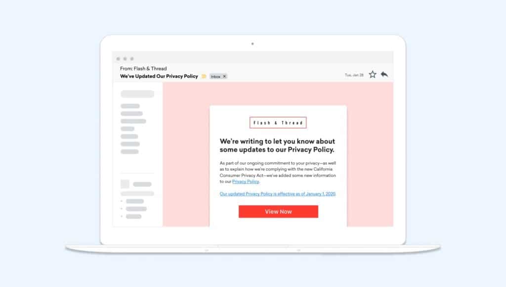 An example of an email campaign from Flash & Thread updating users on their privacy policy. The brand sends this message to web-only users or those who have not opened the app in the last two weeks, because app users previously already received the message.
