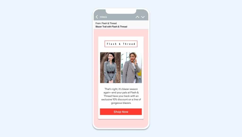 Imagine that Flash & Thread is sending a marketing email campaign highlighting an exclusive sale on a selection of blazers. If their marketers leveraged contextual deep links, they could include images and CTA for different individual items, drive users to the appropriate pages on their mobile app , and then seamlessly track which users clicked on the link associated with the plaid blazer versus the houndstooth one pictured below. With this data on hand, the company can more easily understand their customers and their actions at every touch point, supporting more relevant, personalized email marketing efforts going forward.