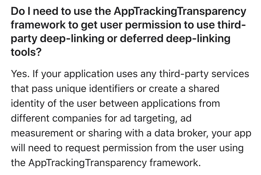 At first glance, it’s possible to read the question itself as Apple upending the use of all deep linking until users have given consent to tracking via the ATT opt-in. However, we believe interpreting the question this way would not be a sincere reading of Apple’s intent, based on their full public answer immediately below it.