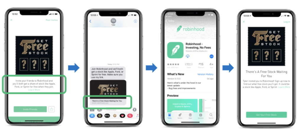 The example below shows Robinhood offering a free share of stock to a referrer and to their referee when they place their first order.
