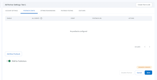 Branch Dashboard → Ad Partner Settings → Postback Config → PAM for Publishers toggle ON