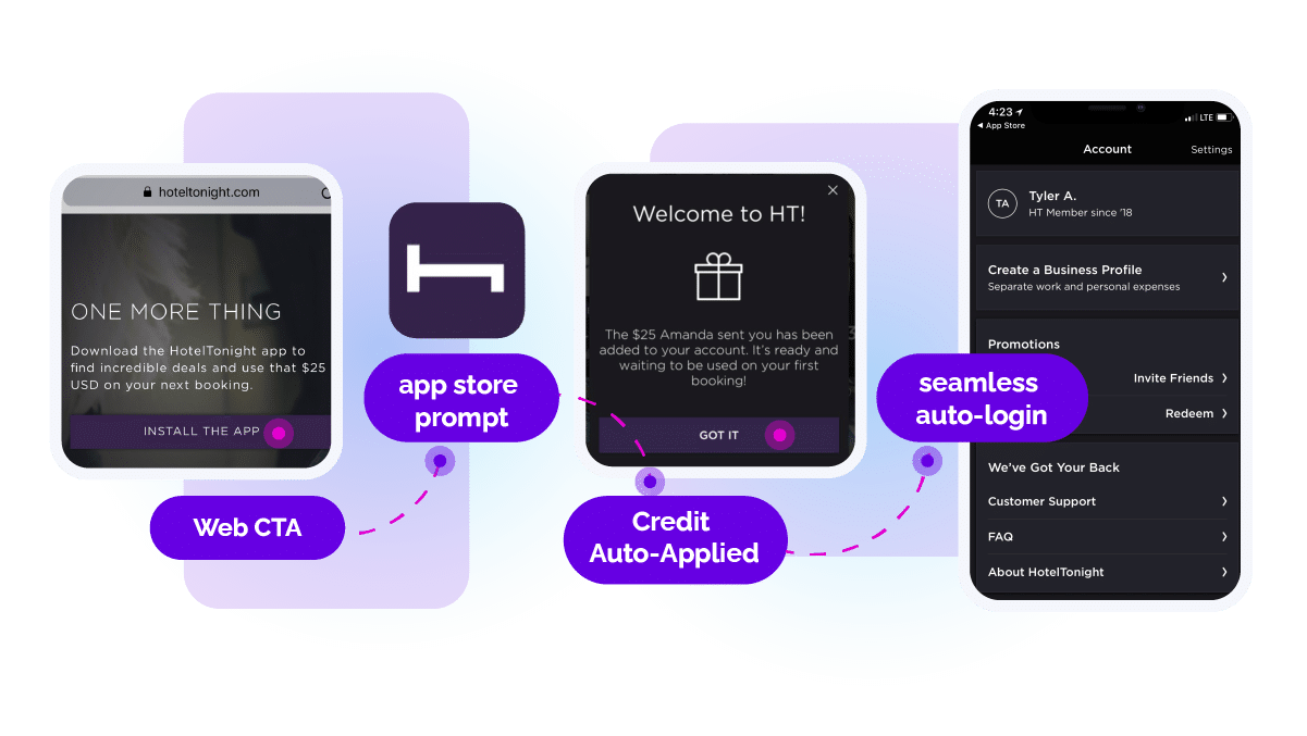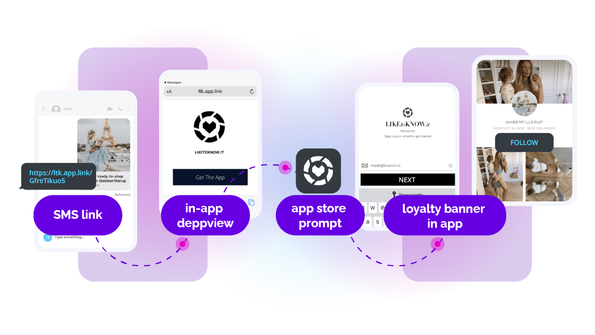 - If they don’t have the app, the link will route them to install the app and then—with context still in place—to the desired in-app content.