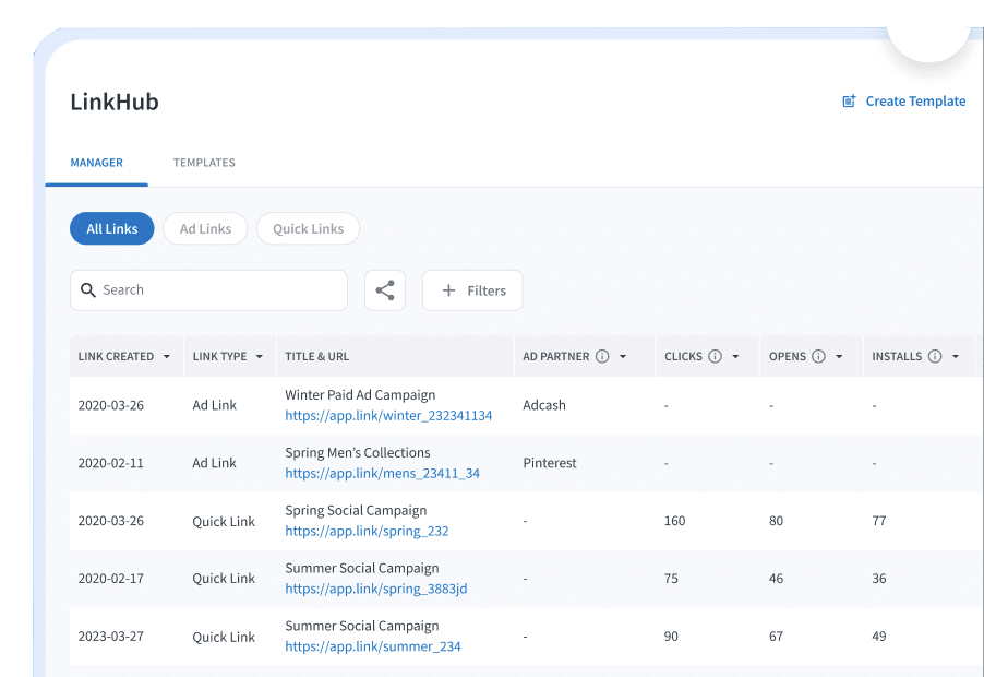 With a new unified link platform, Quick Links, Ad Links, and related tools all live in one place for expedited link creation and analysis. LinkHub provides clean, reliable link data in a unified dashboard view so you can search all past links and data. Filters improve search relevance so teams can scan for consistency, find past campaigns and metrics, and measure Quick Link performance with link-level analytics. It’s never been easier to customize, optimize, manage, and sort through Branch link performance analytics.