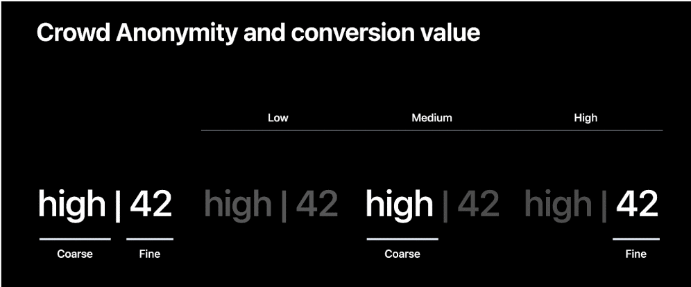 - While Apple still doesn’t specify numbers of users to reach the thresholds of crowd anonymity, it stands to reason that introducing a “coarse-grained” conversion value — lower granularity than available on SKAN 3.0 — will allow apps to send signals of user value at a lower threshold than previously allowed. This will prove useful for advertisers to optimize campaigns earlier than was otherwise possible.
