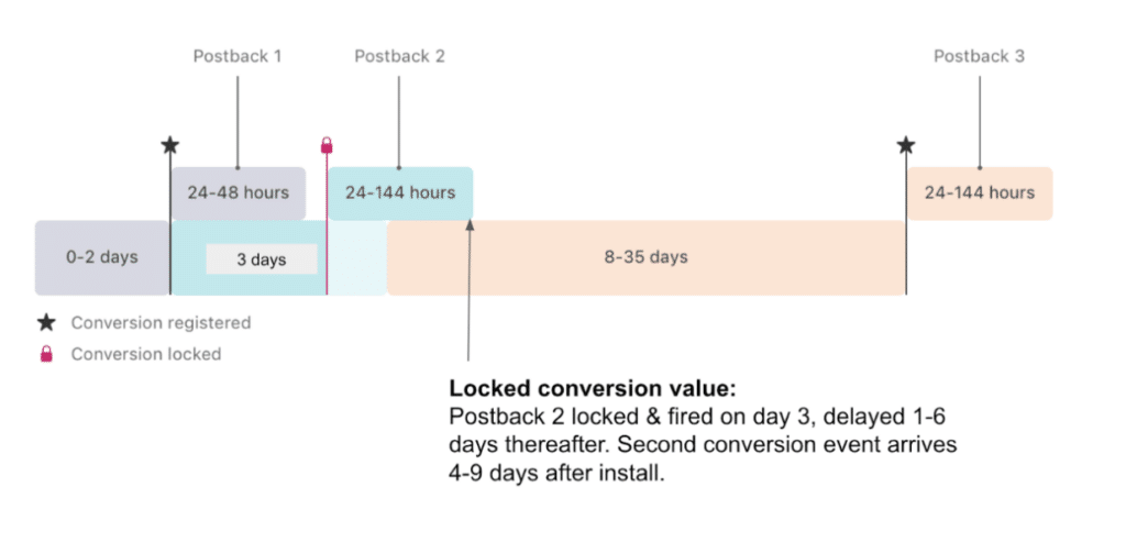 For apps that want to receive postbacks sooner, Apple has introduced the concept of “locking” conversion values. While this won’t decrease the randomized timer for postback windows, it will allow app developers to receive the postback for each window early — before the end of the measurement window.