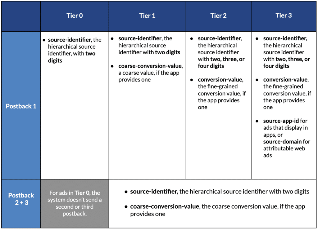 Per Apple, the postback data tier determines the data marketers receive in the postbacks, as follows: