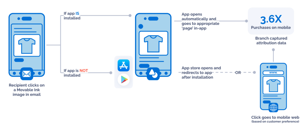 Branch integrates with email service providers and Movable Ink to automatically convert email links into cross-platform deep links that take customers to the content they expect, regardless of their device or platform. Most notably, this joint solution takes users clicking an email on mobile directly to the related content in the mobile app, where conversions and engagement rates are higher.