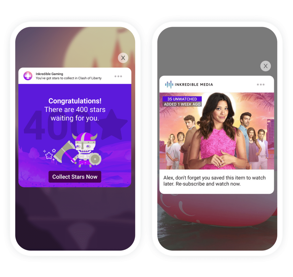 The integration creates a similar experience on the right, where Branch feeds two pieces of information to Movable Ink: the stage of the customer’s subscription cycle and their most recent “Add to Watchlist” choice. In a stellar win-back strategy, Movable Ink then generates a deep linked push notification that encourages the customer to re-subscribe and finish the show.