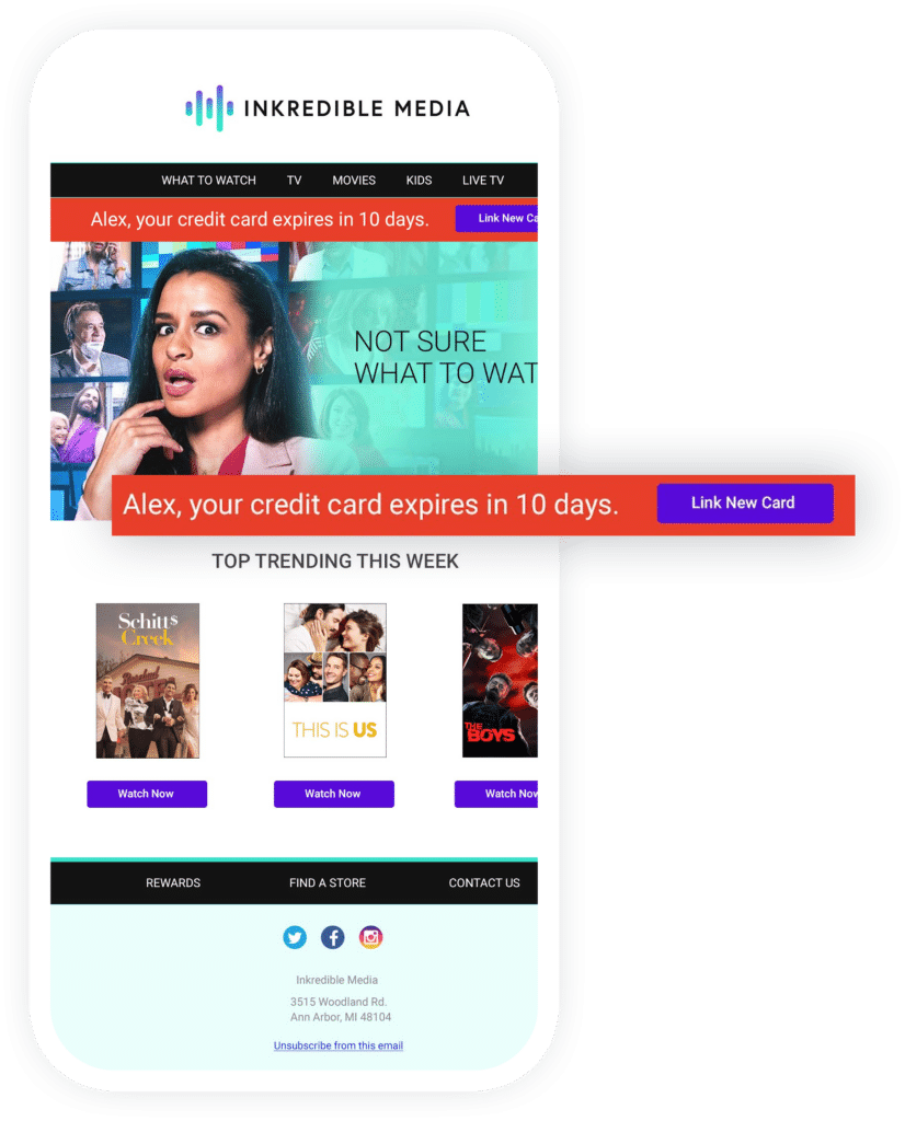 In this last use case, Branch alerts Movable Ink that this customer’s payment method is about to churn. Automatically, Movable Ink powers a personalized banner that reminds the customer to update their card before the upcoming expiration date. Customers can quickly link a new card to ensure that their viewing never has to stop.