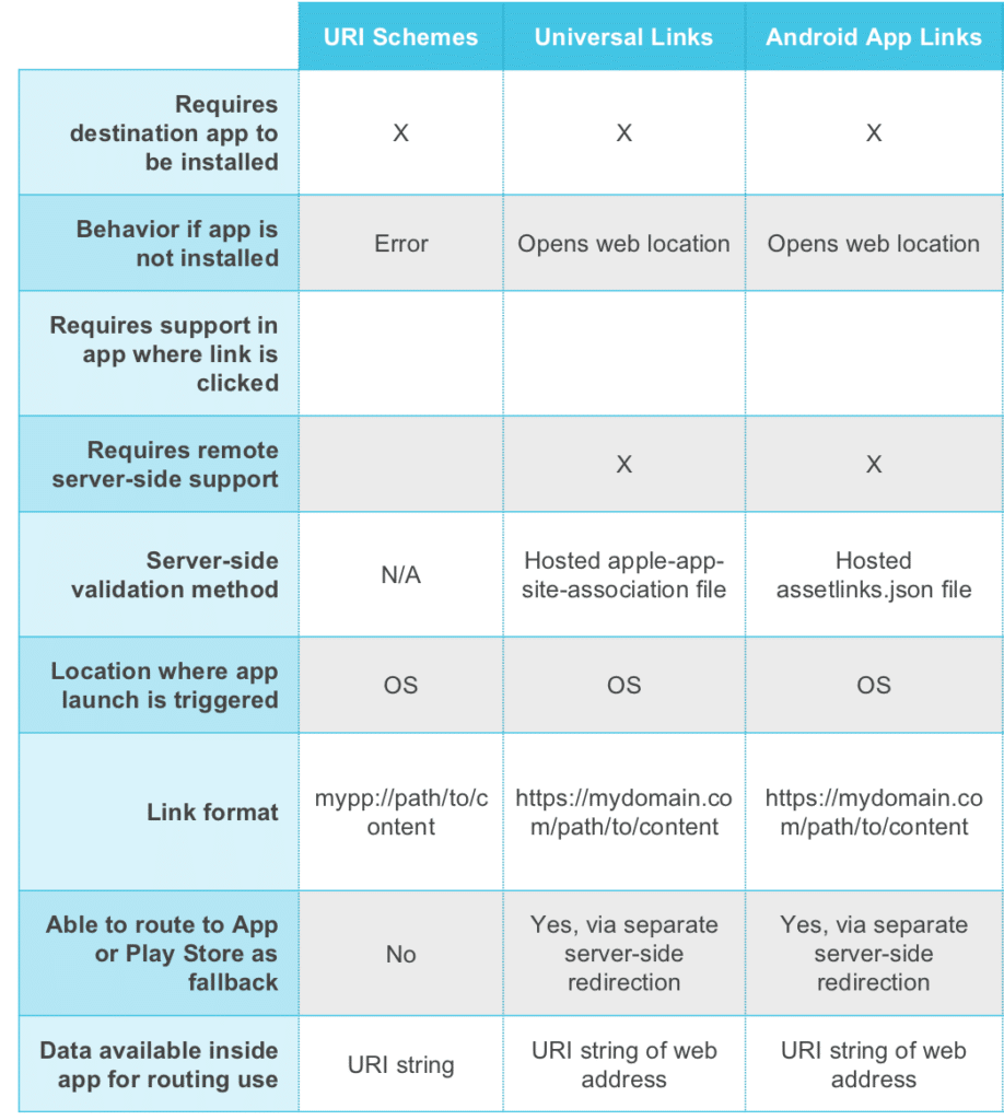 Here’s an overview of how URI schemes compare to Universal Links and Android App Links on several key criteria: