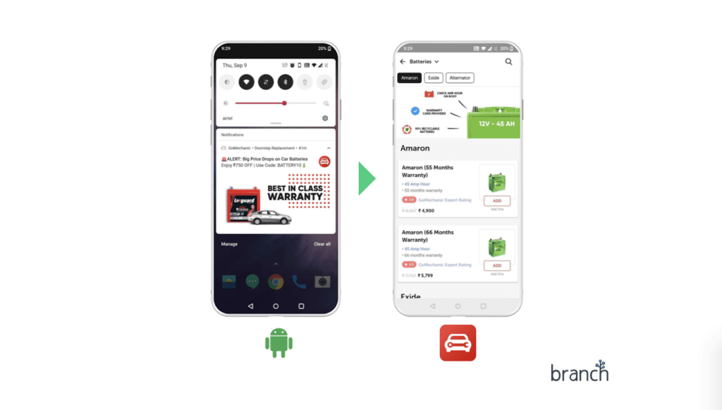GoMechanic uses predictive analytics to send a push notification for Battery sales to a customer with high-intent to purchase. The notification sends the user directly into the battery purchase page for a seamless experience.