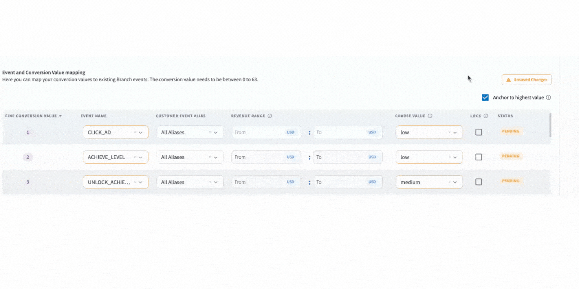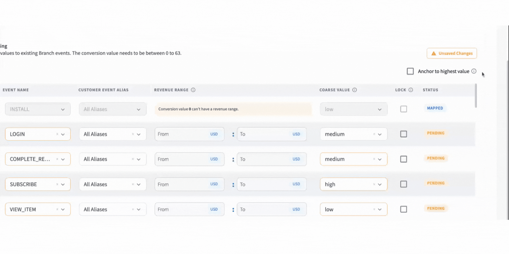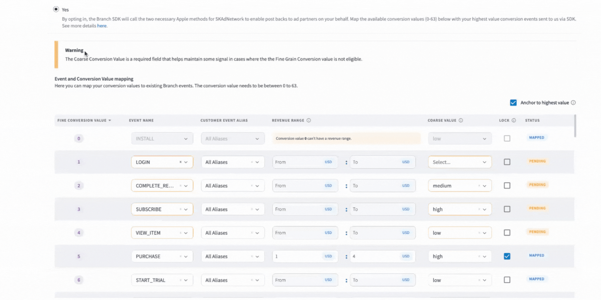 If you use Branch to manage your SKAN conversion values (most common), you can now assign coarse values to mapped events within the updated SKAN conversion value mapper in our dashboard. This way, you can understand and optimize your campaigns more effectively across all versions of SKAN.