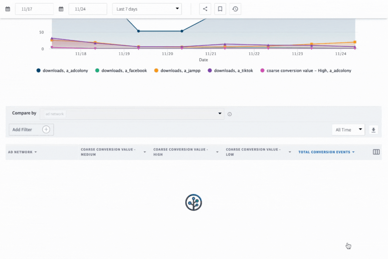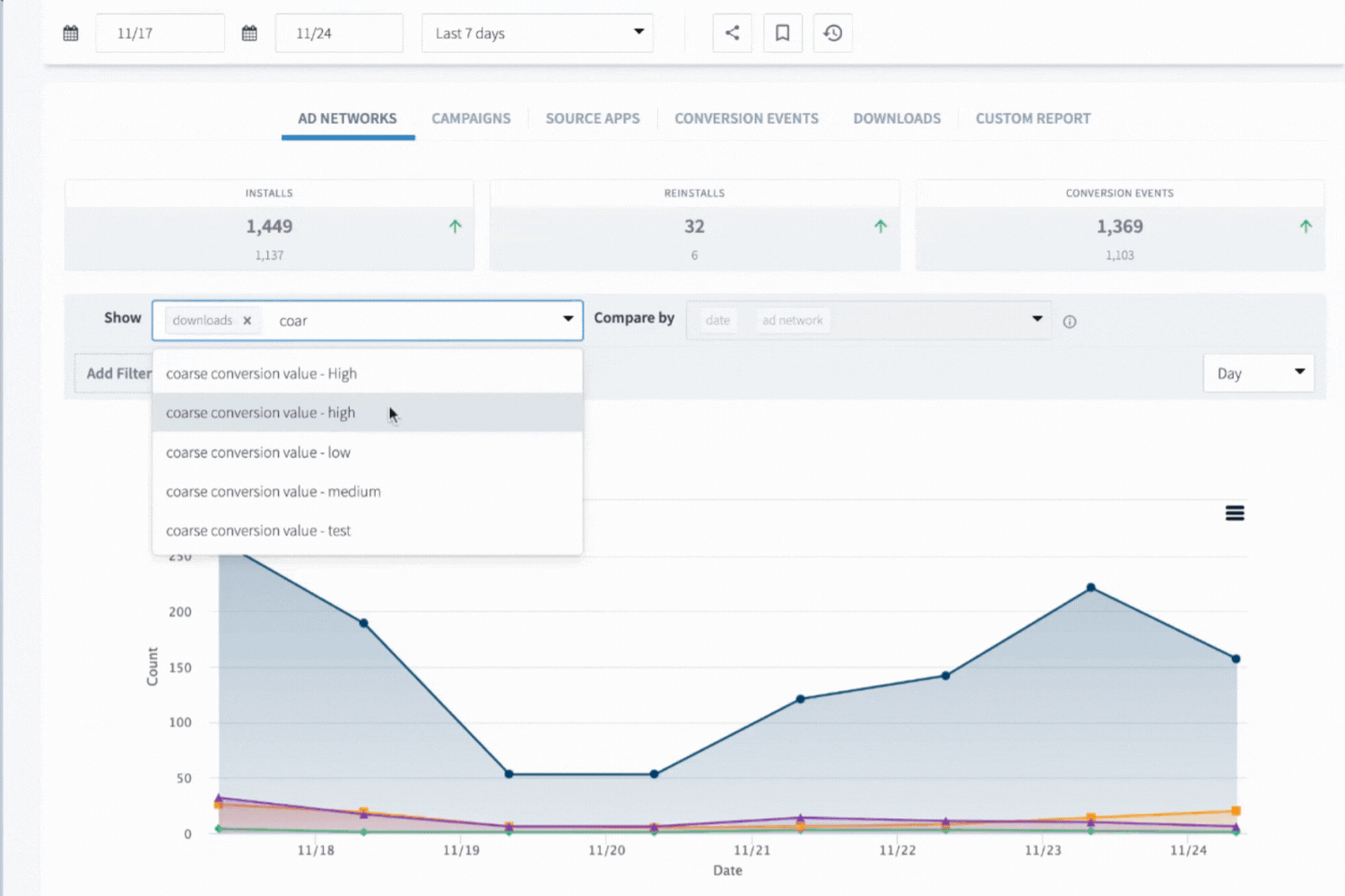 Now, you can view the aggregate counts of events and postbacks by coarse-grained values within the SKAdNetwork Analytics view.